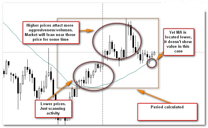 Let's say, MA calculates 35 closing prices (35 parameter). Do you think that every price is equal here? Area located at higher prices is more significant for the market because it attracts more volumes (aggresiveness). So in fact weight of higher prices in calculation formula should be increased if we want to know where value is.